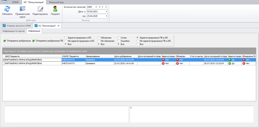 o Не зарегистрирована ПК в ИС. Отображается список прививочных карт, не зарегистрированных в сервисе;