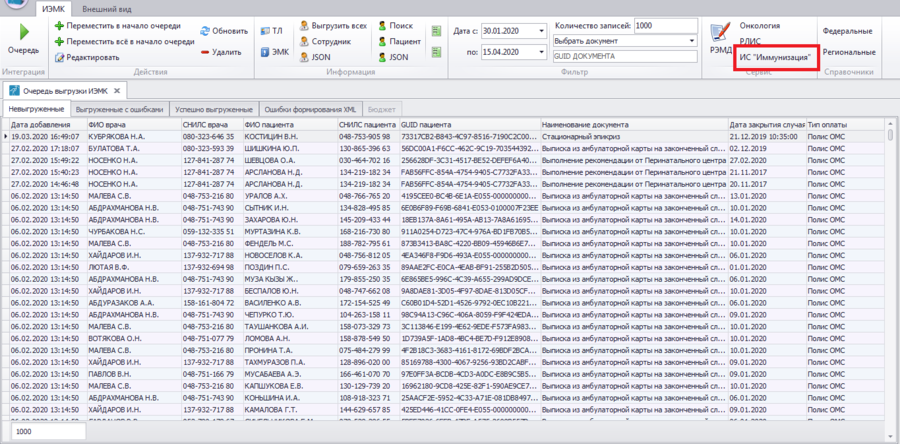 Для доступа к модулю ИС "Иммунизация" необходимо в открывшемся окне формы Очередь выгрузки ИЭМК нажать кнопку ИС "Иммунизация" в панели инструментов (Рисунок 1).