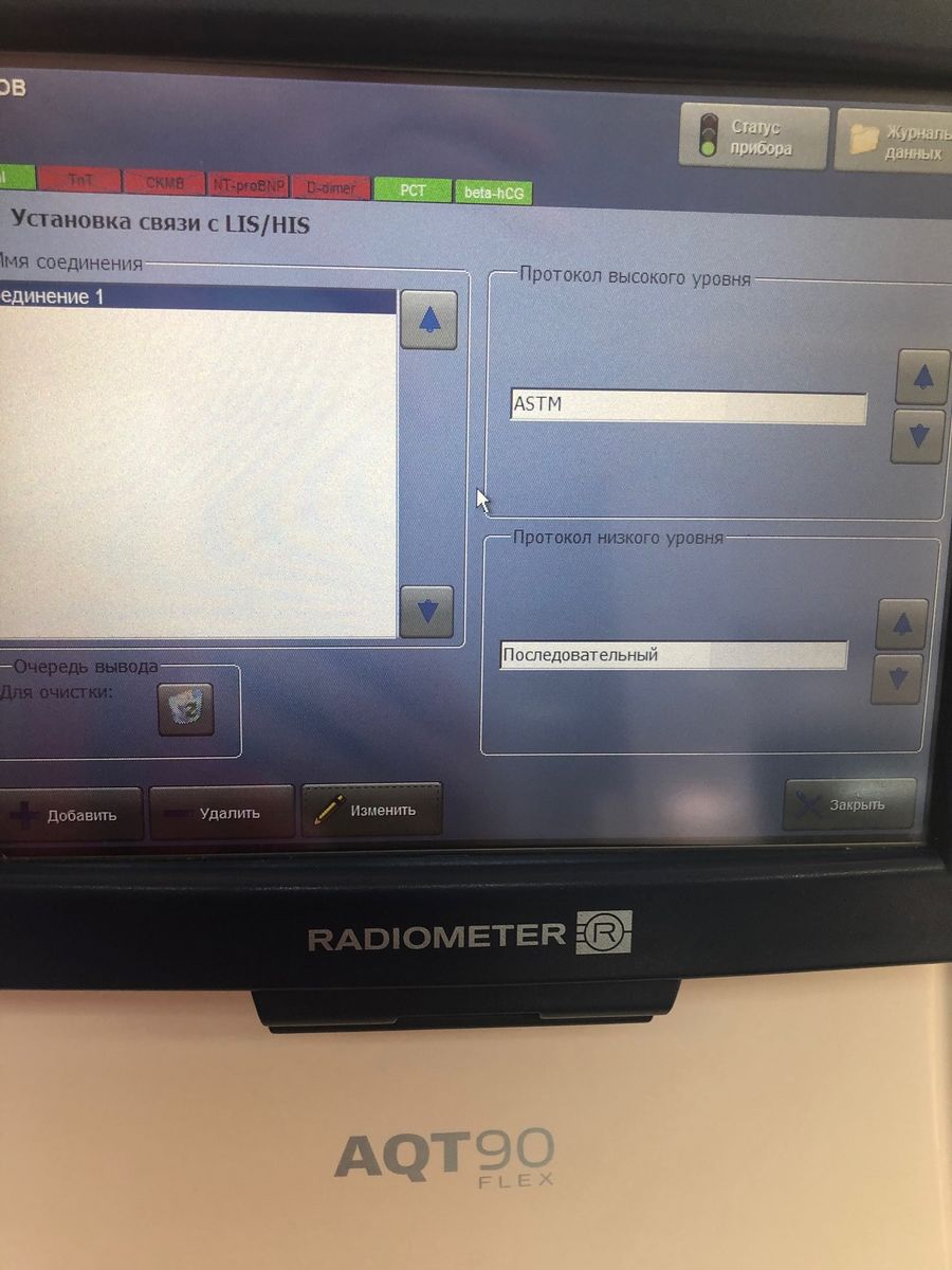 Имя соединения: Соединение 1 Протокол высокого уровня: ASTM Протокол низкого уровня: Последовательный